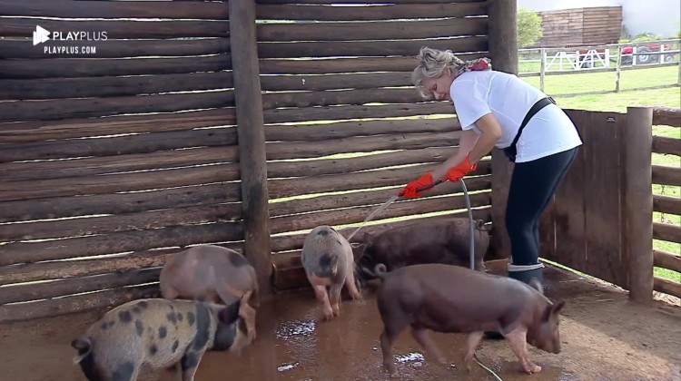 Andréa Nóbrega fica com medo de briga dos porcos no chiqueiro