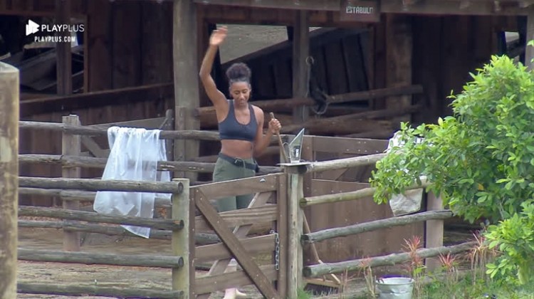 Apesar do dia nublado, Sabrina Paiva acordou bem-humorada para fazer suas tarefas diárias. Nesta segunda-feira (11), ela cantou sertanejo para limpar curral da sede.