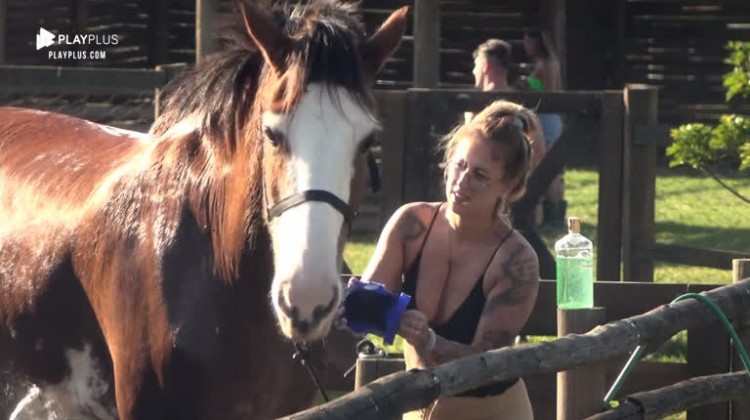 Nesta terça-feira (1º), o sol brilhou forte em A Fazenda . Sendo assim, os peões deram um banho refrescante no cavalo Lion.