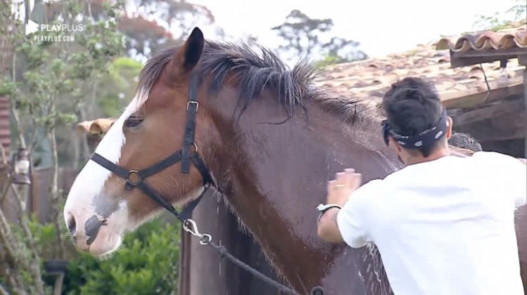 Para aproveitar a tarde de sol, nesta terça-feira (22), Lucas Viana e Diego Grossi deram um banho no cavalo. Lyon se refrescou no calor. Veja!