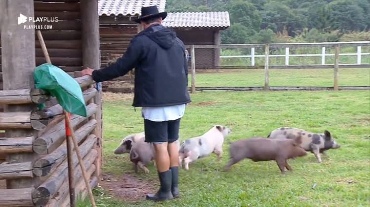 Nesta quinta-feira (14), Lucas Viana acordou cedo e enfrentou a chuva para cuidar dos porcos. O peão limpou o chiqueiro, enquanto os bichos brincaram na área externa.