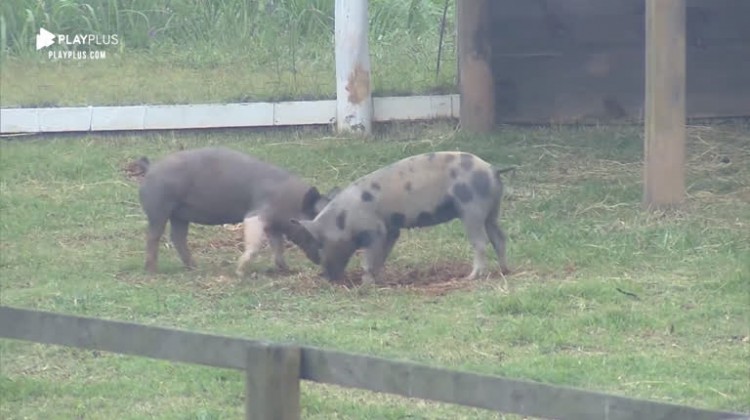Rodrigo Phavanello limpa chiqueiro, enquanto os porcos se divertem