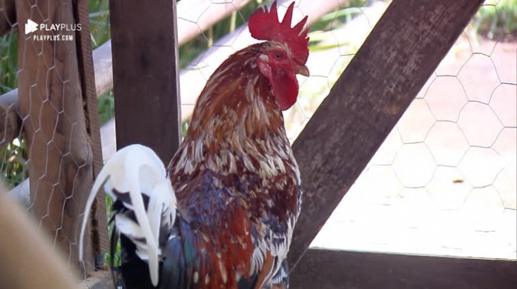 Sabrina observa Thayse cuidando do galinheiro e fala sobre a beleza do galo.