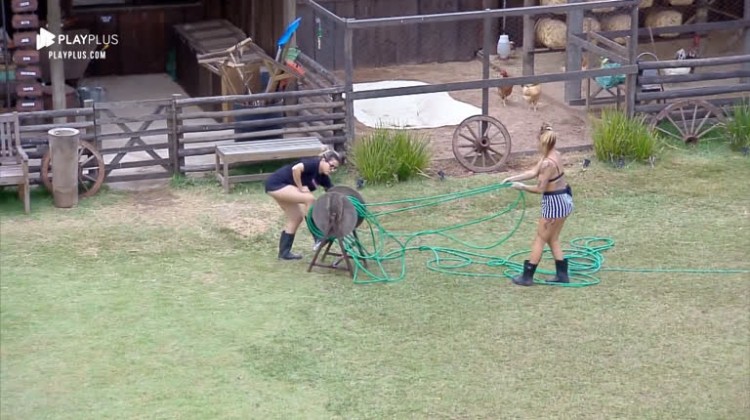 Thayse Teixeira estava muito atrapalhada , na manhã desta sexta-feira (18). E a peoa precisou da ajuda de Bifão com o carretel de mangueira, que estava todo 'emaranhado'. Veja!