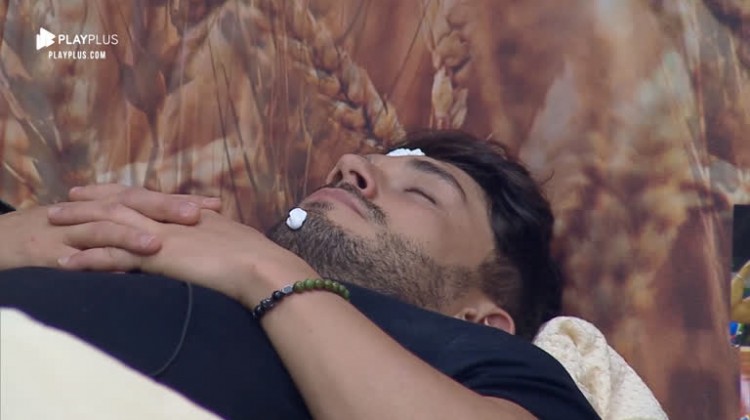 Lucas foi alvo de uma pegadinha armada por Thayse. A peoa não se aguentou ao ver o modelo dormindo tranquilamente e tratou de colocar creme no rosto do colega. Guilherme entrou na brincadeira ao fazer cócegas com um palitinho no nariz do amigo.