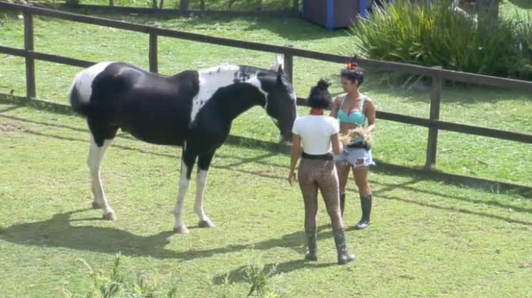 Aline e Mileide interagem com o cavalo Colorado - A Fazenda 13